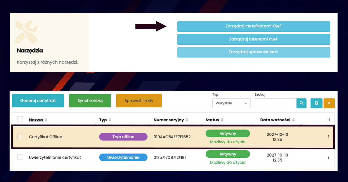 Jeśli wybierzesz środowisko testowe, w module KSeF → **Narzędzia znajdziesz opcję Generowanie certyfikatów testowych. To specjalne klucze służące wyłącznie do testów. Dzięki nim możesz: